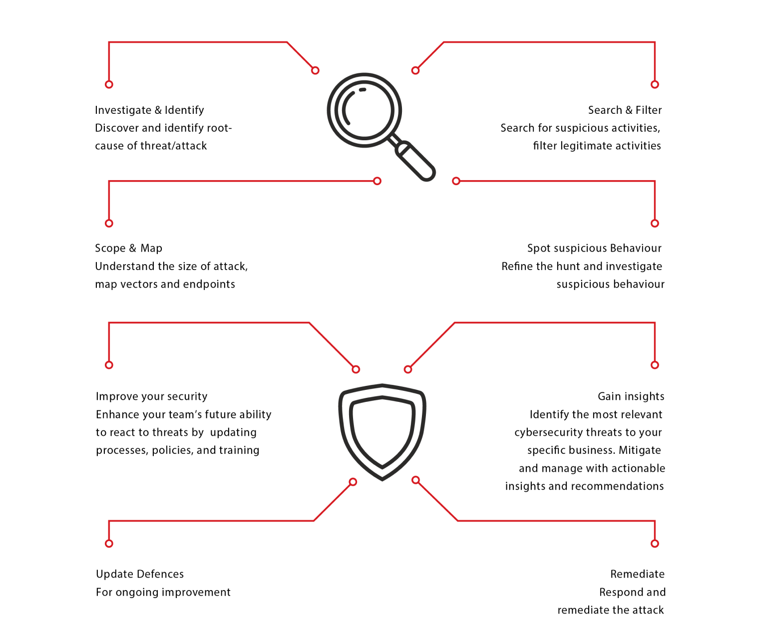 Our proactive threat hunting starts with real-time monitoring and detection of known and unknown threats arriving from a variety of sources. Searching for suspicious activities while filtering legitimate ones. Once we found suspicious activity, we dive deeper, identify root-cause, map and scope the attack, remediate, and update defenses.